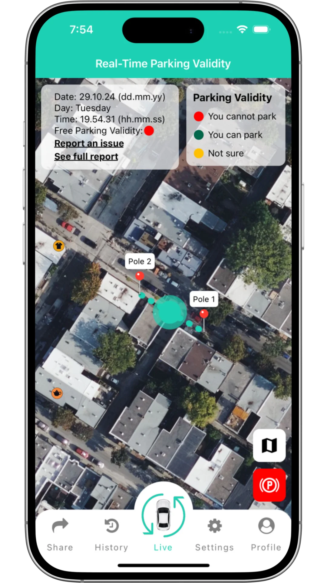 Predicts high-probability available spots based on time, history, and traffic patterns.