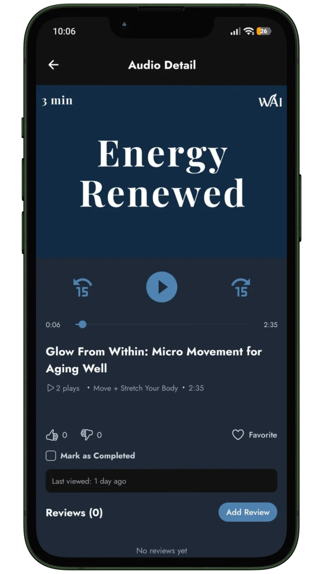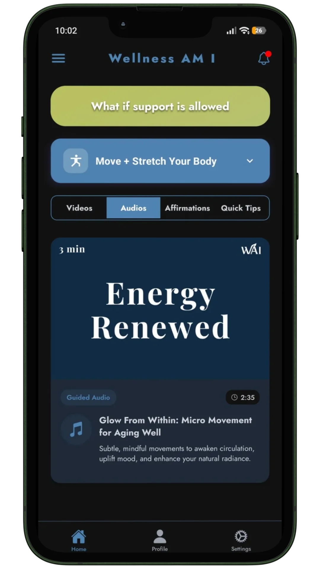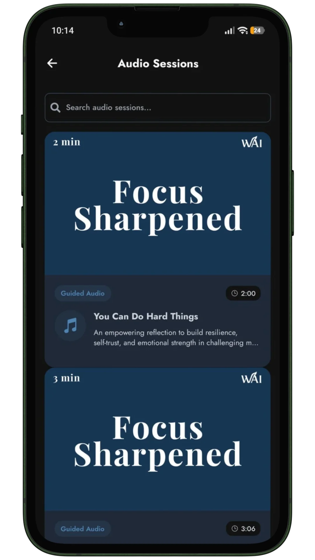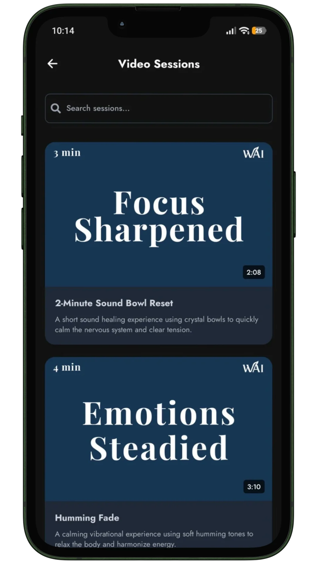 Access guided sessions, meditation audios, wellness videos, affirmations, and quick tips.