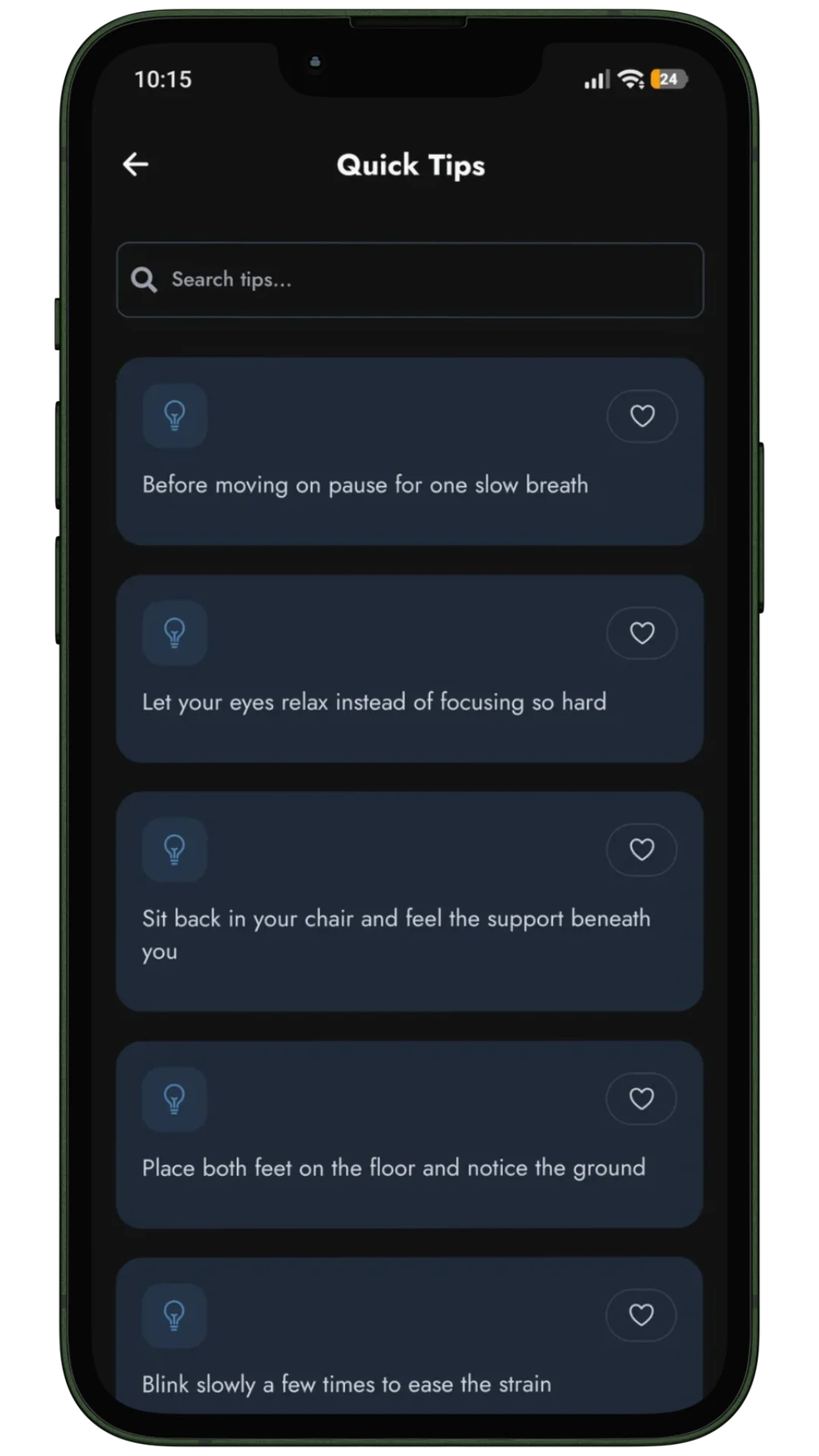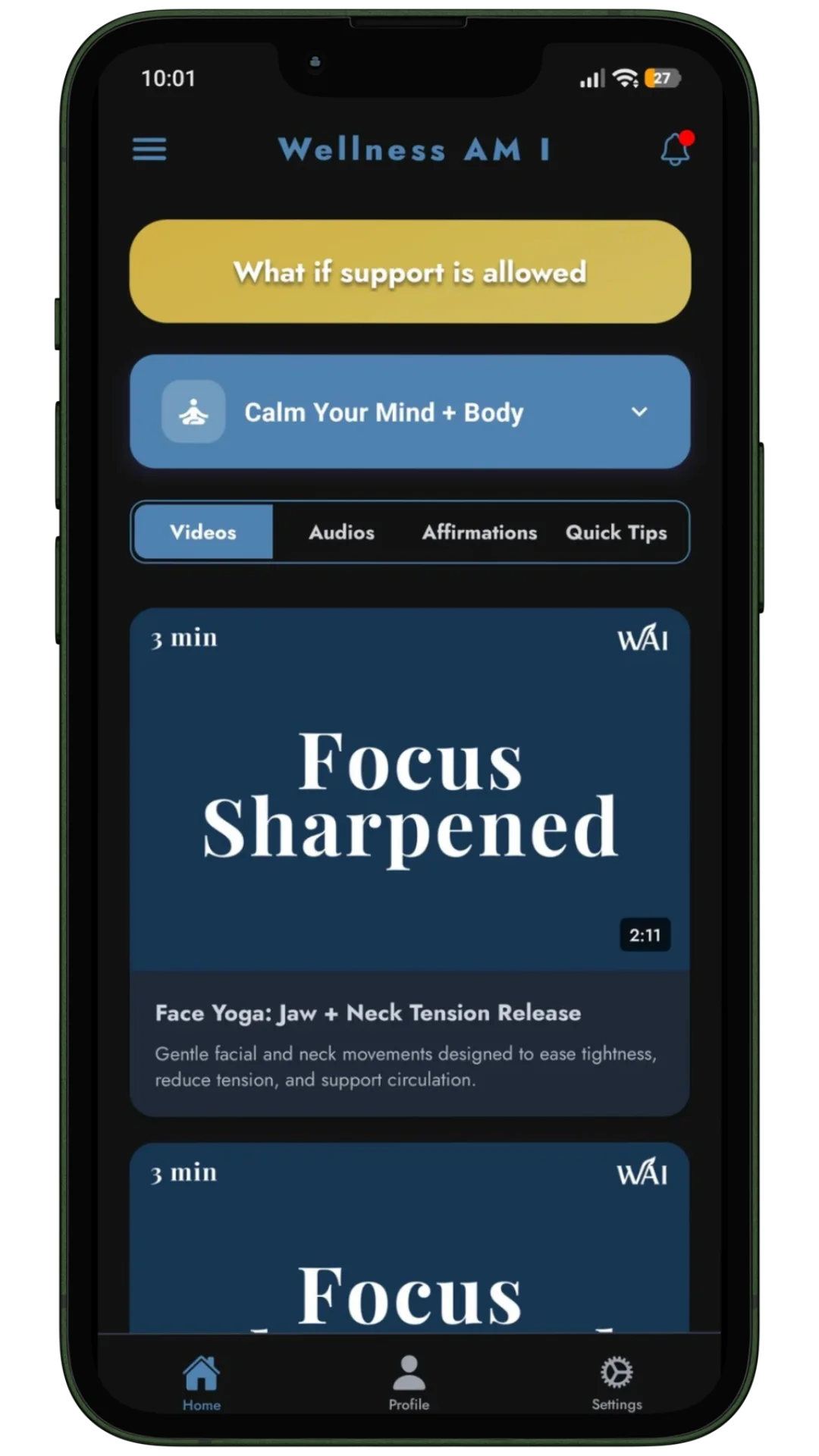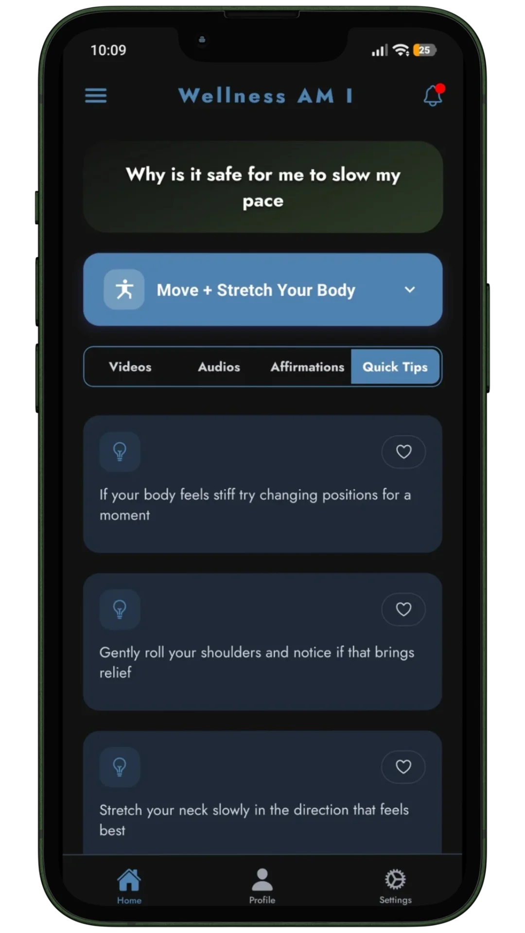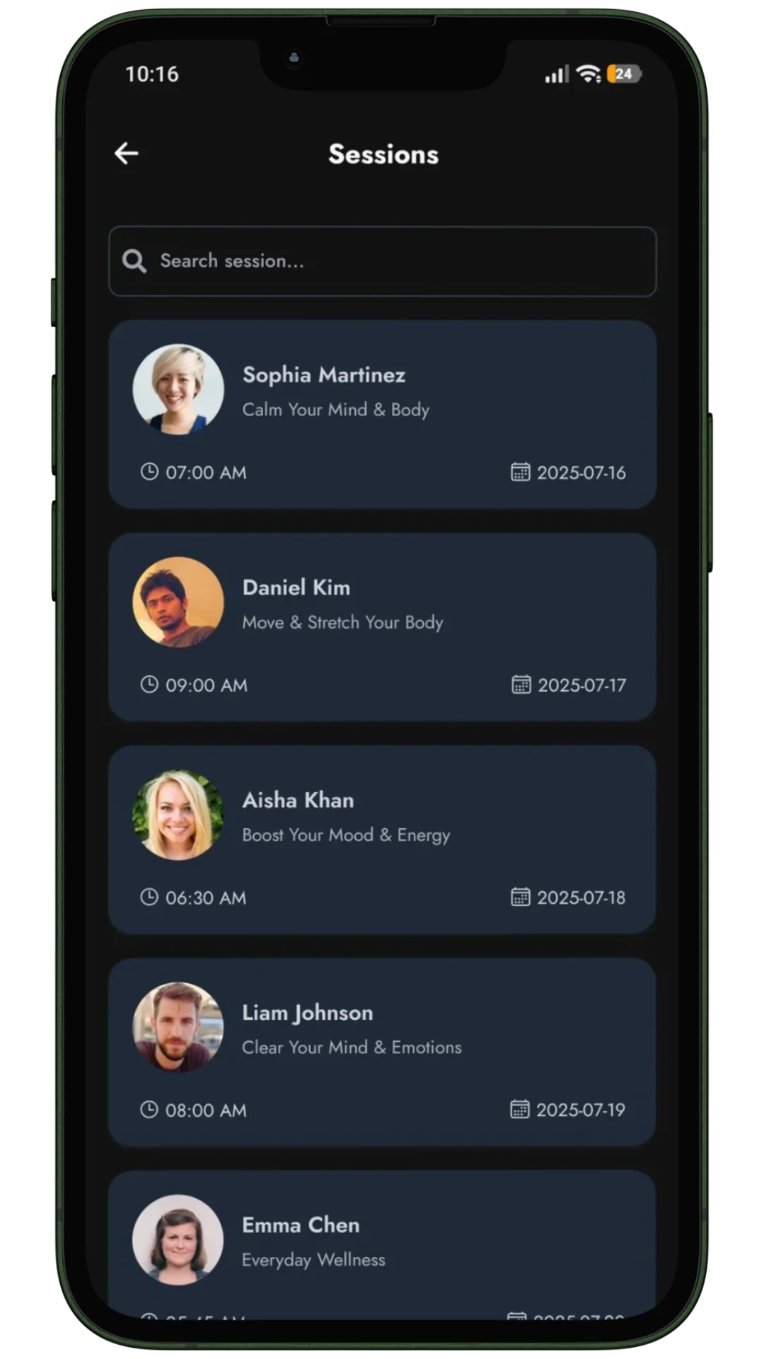 Access guided sessions, meditation audios, wellness videos, affirmations, and quick tips.