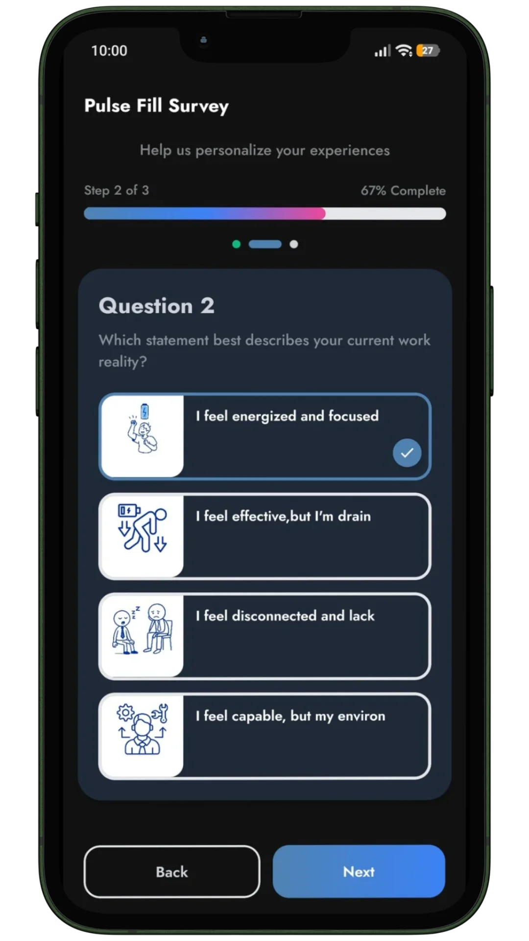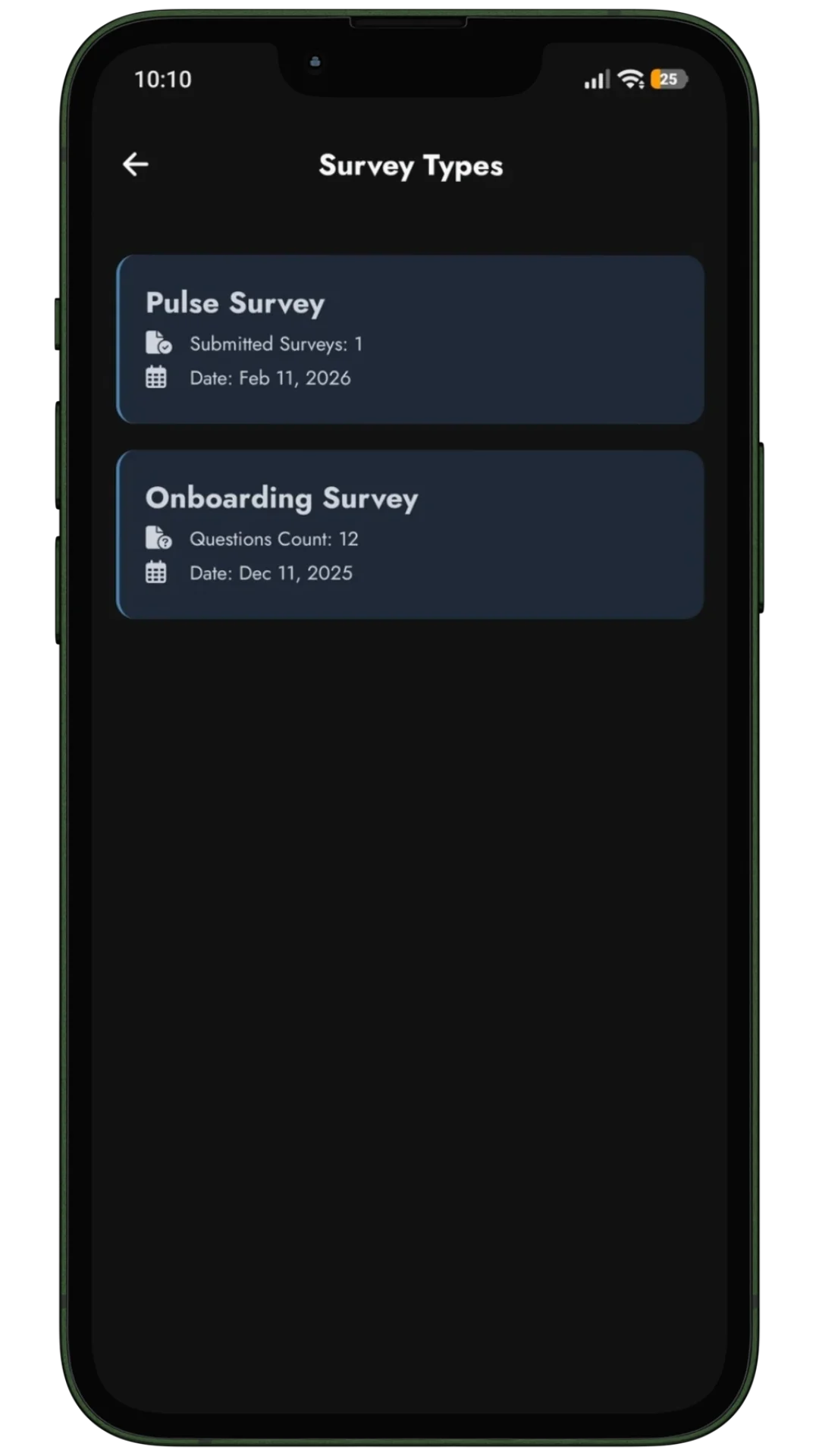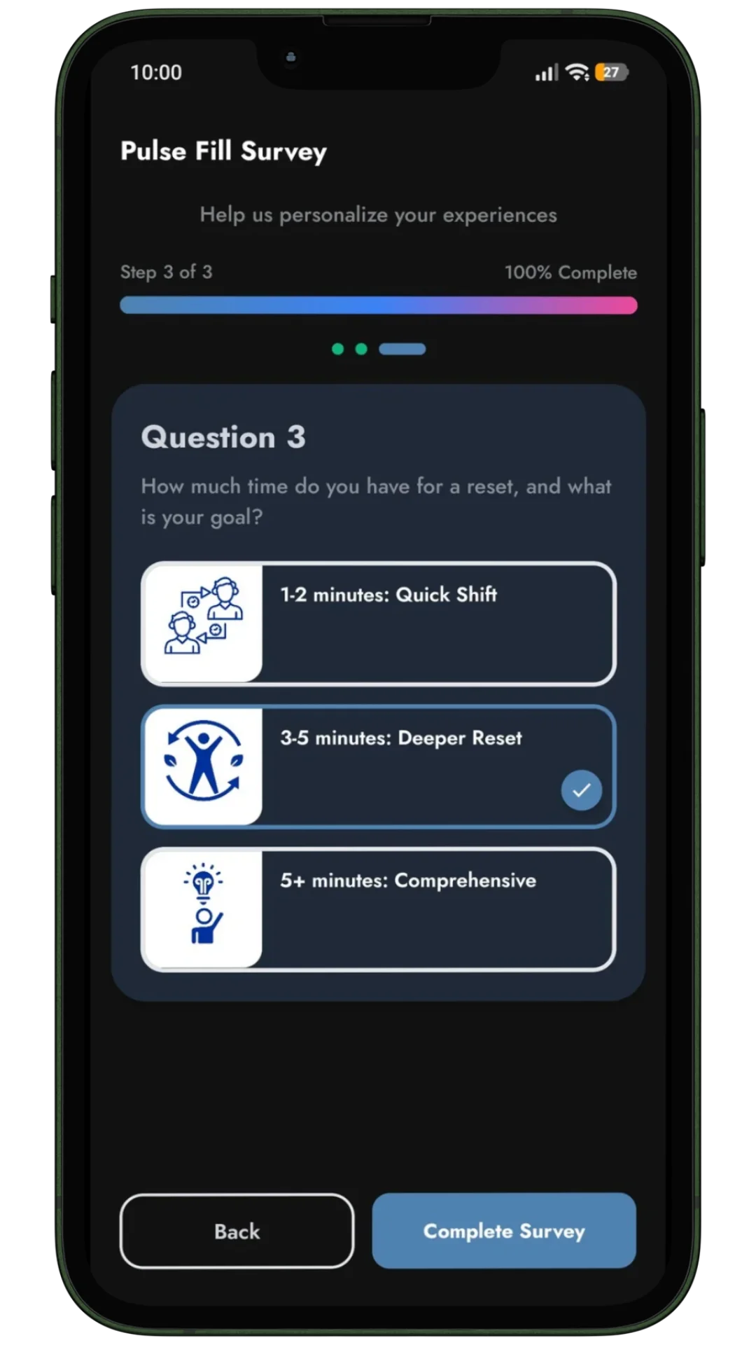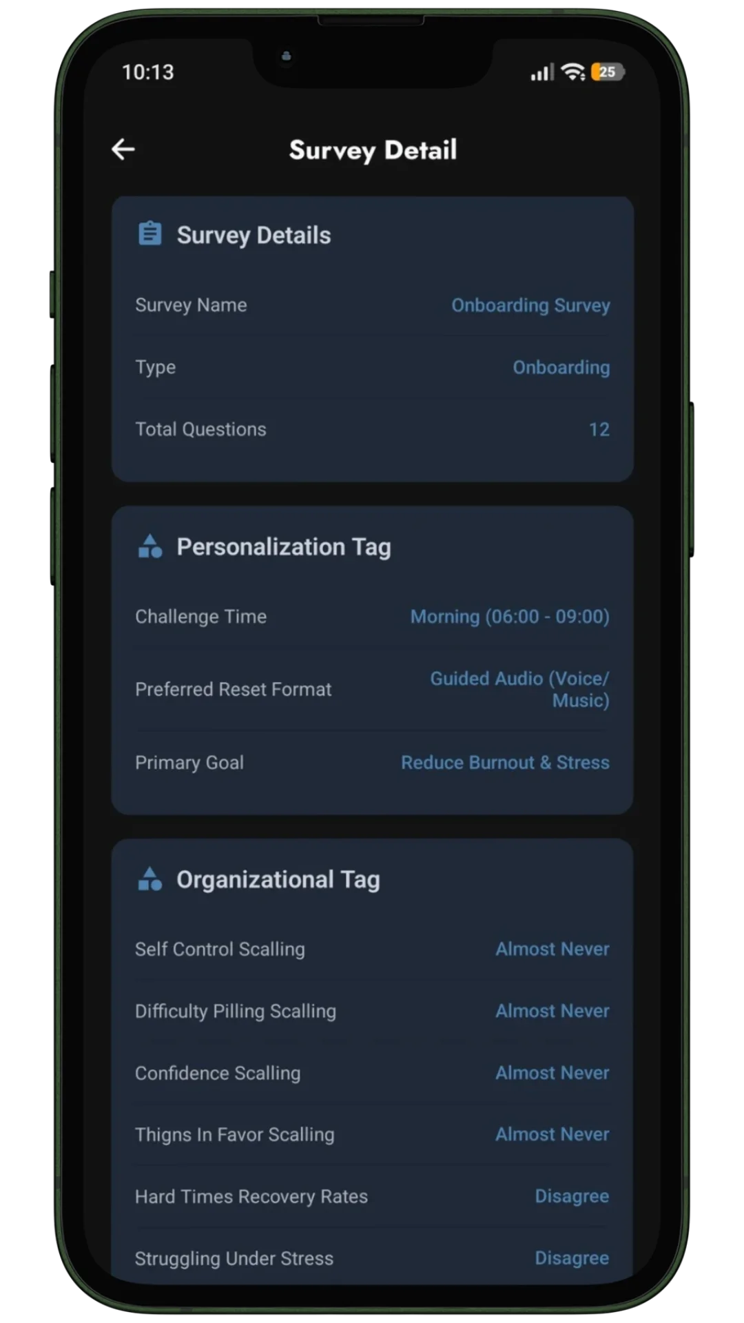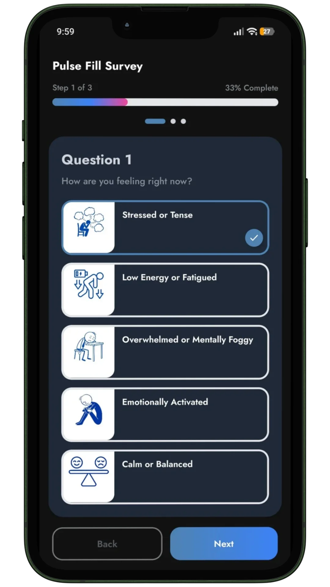 Quick check-ins and detailed surveys to measure mood, stress levels, and overall wellbeing.